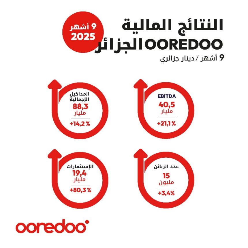 تُظهر النتائج المالية لمؤسسة اوريدو الجزائر خلال التسعة أشهر الاولى من سنة 2025 إرادة المؤسسة في المساهمة بشكل أكبر في تطوير قطاع الهاتف النقال في الجزائر، من خلال تسريع وتيرة رقمنة خدماتها وحلولها التكنولوجية في السوق وإثراء التجربة الرقمية لزبائنها الذين يمثلون قلب اهتماماتها