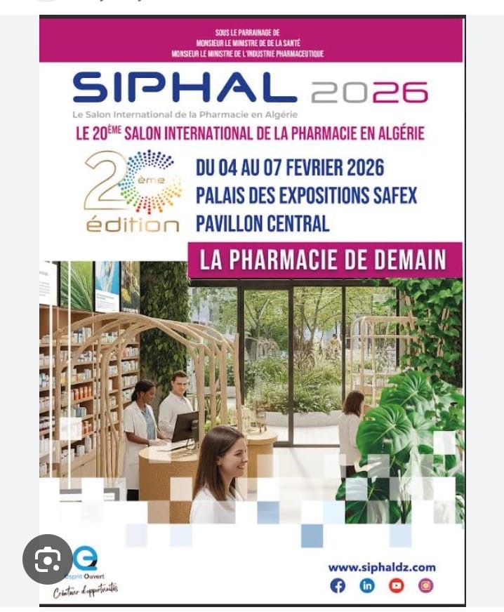 ويُذكر أن الطبعة العشرين من الصالون الدولي للصيدلة في الجزائر تُنظَّم من 04 إلى 07 فيفري 2026 بالجناح المركزي لقصر المعارض “سافكس”، تحت رعاية وزير الصحة ووزير الصناعة الصيدلانية.